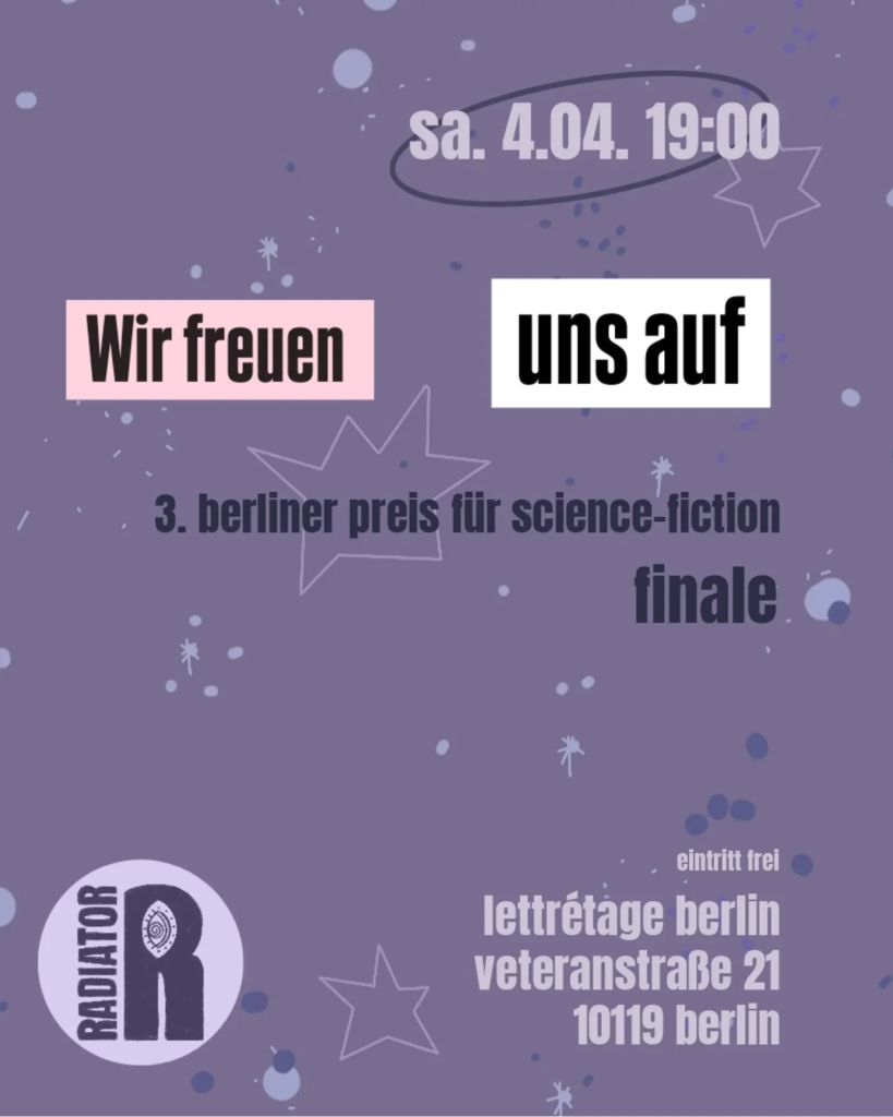 "Bereits zum dritten Mal haben wir den Berliner Preis für Kurzgeschichten im Bereich Science-Fiction ausgeschrieben. Diesmal lautet das Thema: 404: Fehlercode. Und am 04.4 um 19 Uhr findet das Finale in der @lettretage statt! Mit einer ganz wunderbaren Jury!